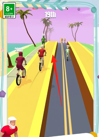 3、在海滨赛道,让角色朝着【箭头】所指方向,紧跟绿色骑手,利用直道加速,提升排名。