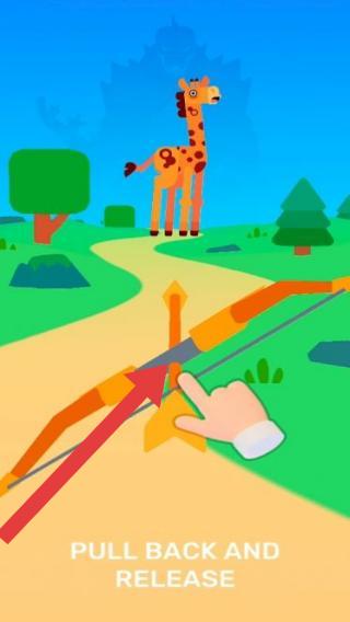 2、画面中显示卡通风格的长颈鹿,下方有一把弓箭,配文“PULLBACKANDRELEASE”,提示玩家拉弓并释放来进行射击操作。