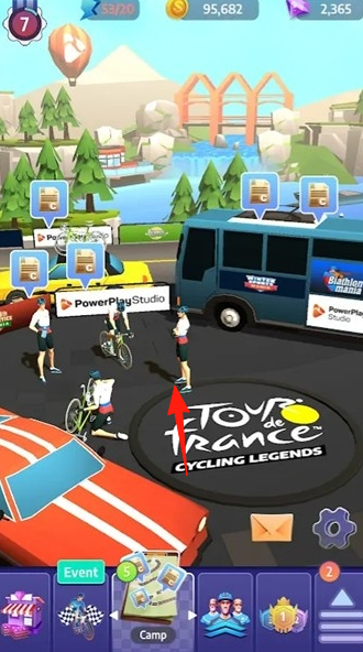 1、在营地界面,点击【箭头】指向的角色,进行赛前准备,如查看任务、装配道具。