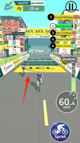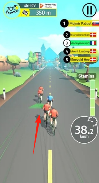 2、比赛中,操控橙色队服的自行车手,沿【箭头】指向路线,保持节奏,跟紧前方车手。