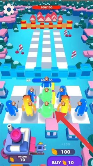 2、画面中能看到彩色的卡通角色排列,上方显示生命值(HP)信息,左下角有收入(INCOME)数值,右下角是购买按钮及花费。