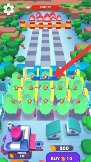 1、画面中有不同颜色的卡通角色,屏幕上方显示生命值(HP),下方有收入(INCOME)数值,还有购买(BUY)按钮及对应花费。