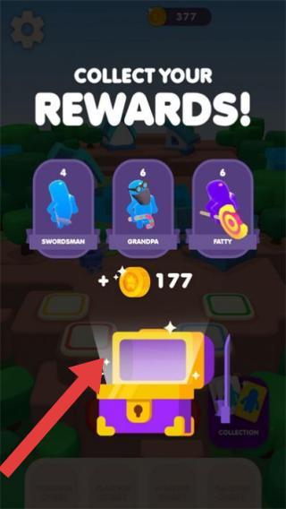 3、文字“COLLECTYOURREWARDS!”提示玩家领取奖励,界面展示了三个奖励物品,下方显示可领取177枚金币,还有一个宝箱图标,点击宝箱可领取奖励。