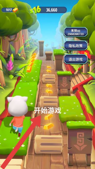 1、画面中显示开始界面,有角色、金币、点击【开始游戏】等元素,还有“客服”“隐私政策”“退出游戏”等功能选项。