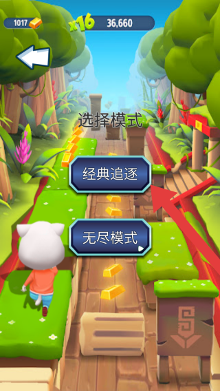 2、有“经典追逐”和“无尽模式”两种模式可选,画面呈现特色的跑酷场景,还有角色、金币等元素。