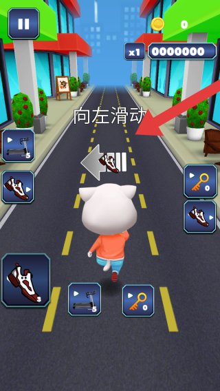 3、画面中显示角色在道路上奔跑,有“向左滑动”的操作提示,以及金币、道具等元素。