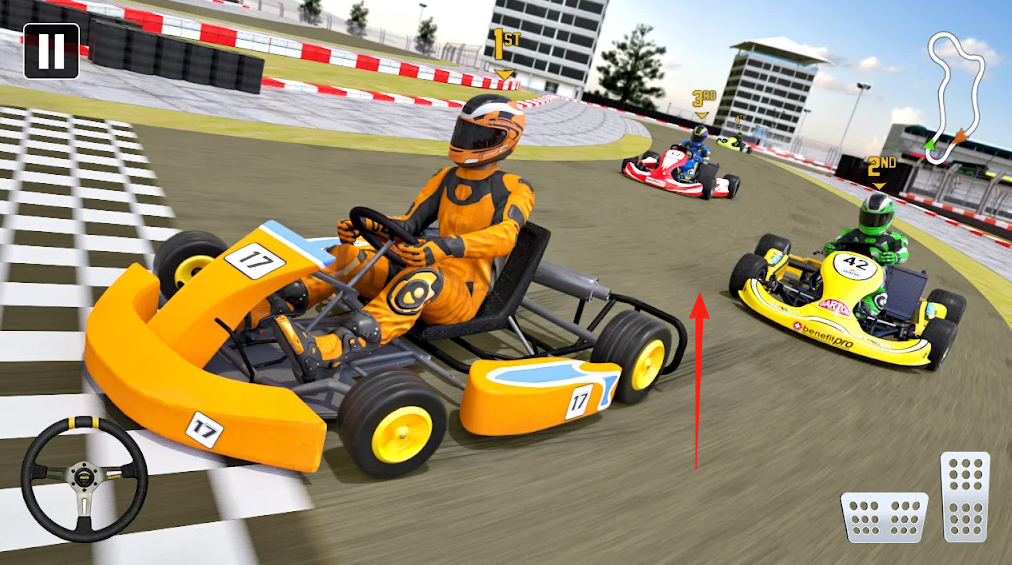 1、比赛时,操控黄色卡丁车,沿【箭头】指向赛道,灵活转向,超越前方车辆。