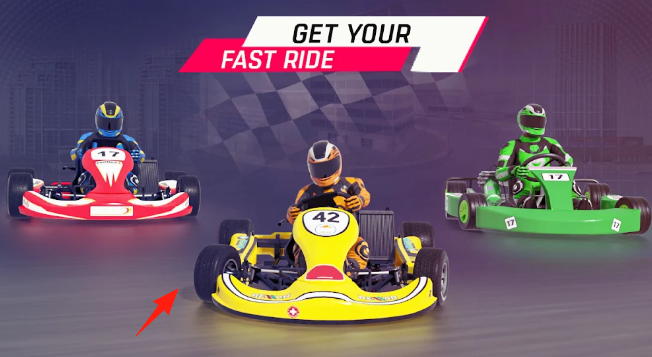 2、选车界面,点击【箭头】指向的黄色卡丁车,选用该车,利用其性能参赛。