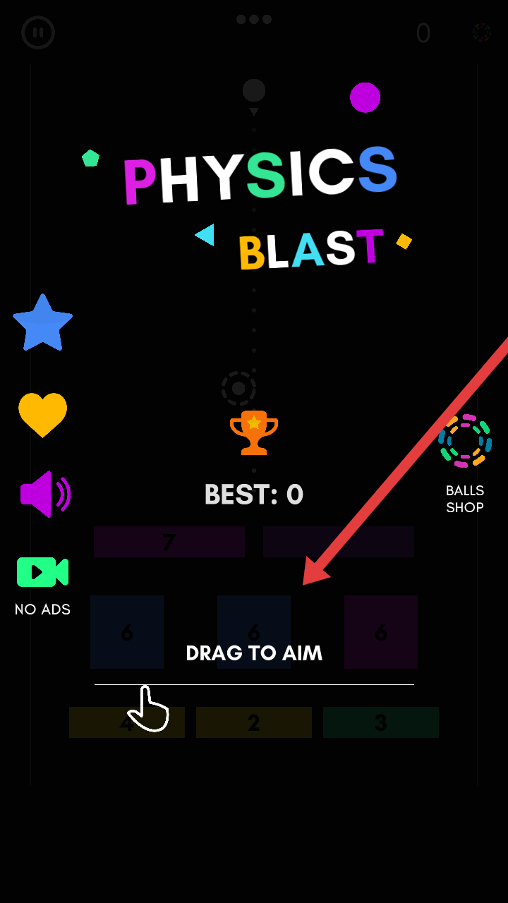 1、进入物理爆炸游戏主界面,黑色背景搭配彩色元素,右侧有【BALLS SHOP】等功能,依据【DRAG TO AIM】提示,拖动屏幕瞄准,开启物理弹球挑战。