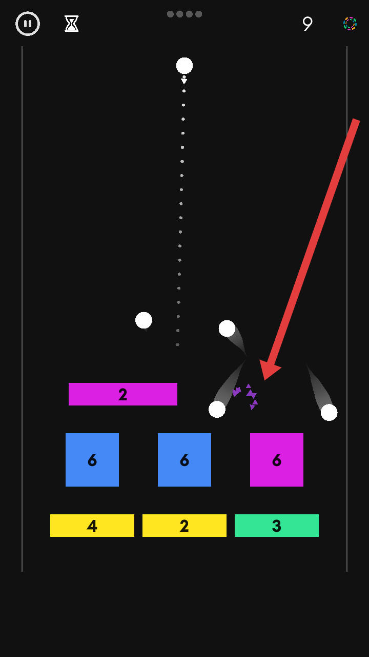 2、游戏中拖动白色小球瞄准,发射后借助物理反弹,撞击标有数字的彩色方块(如粉色“2”、蓝色“6”),通过碰撞改变方块数字,积累得分。