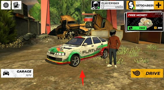 2、进入车库,选中【箭头】指向的Flatline涂装赛车,点击“DRIVE”,准备参赛。