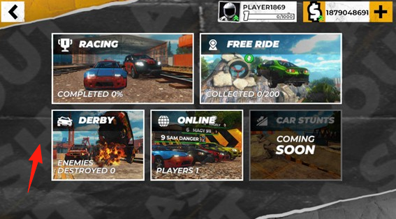 3、在模式选择页,点击【箭头】指向的“DERBY”模式,进入该赛事,与敌人赛车对抗。