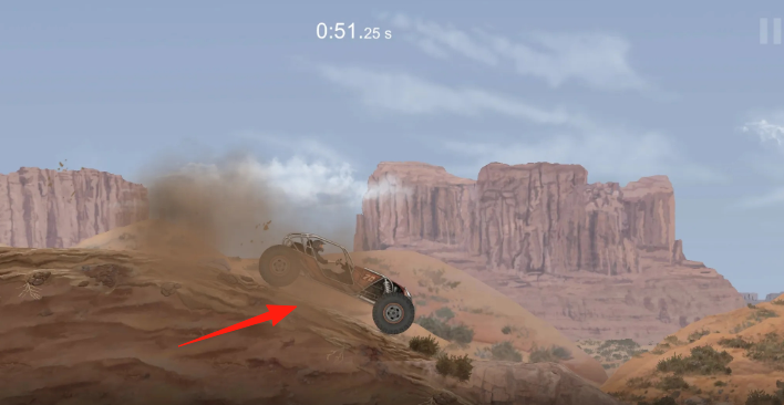 3、面对沙坡,调整车速与角度,顺着【箭头】方向,利用惯性冲坡,完成越野。
