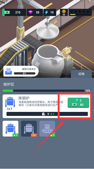 3、赚取到的资金可以升级设备,通过对设备的升级能够减少加工时间,提高产品效率,还可以进行建造多个车间。