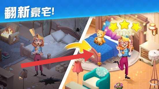 2、积累星星后,进入豪宅翻新,按照箭头指引,将破旧房间改造为星级卧室(19823分),提升家园美观度。