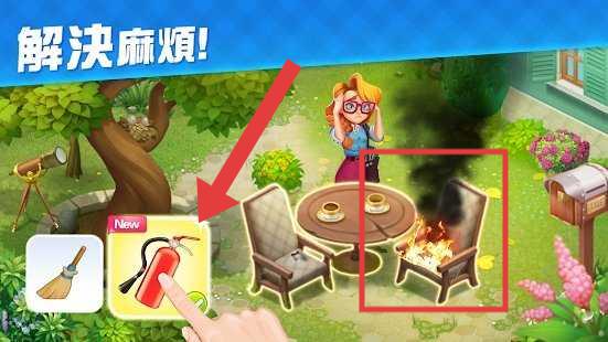 3、遇到庭院麻烦(如着火椅子),点击箭头指向的灭火器道具,解决问题,推进家园修复进程,解锁新区域。