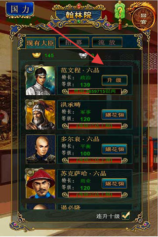 2、大臣养成:进“翰林院”,培养“范文程”等大臣,升等级、提属性,增强国力(189.02万)。