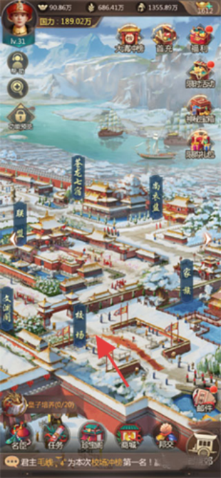 1、场景交互:在宫廷地图,点“校场”参与活动,完成“00:57:39”等限时任务,获奖励。