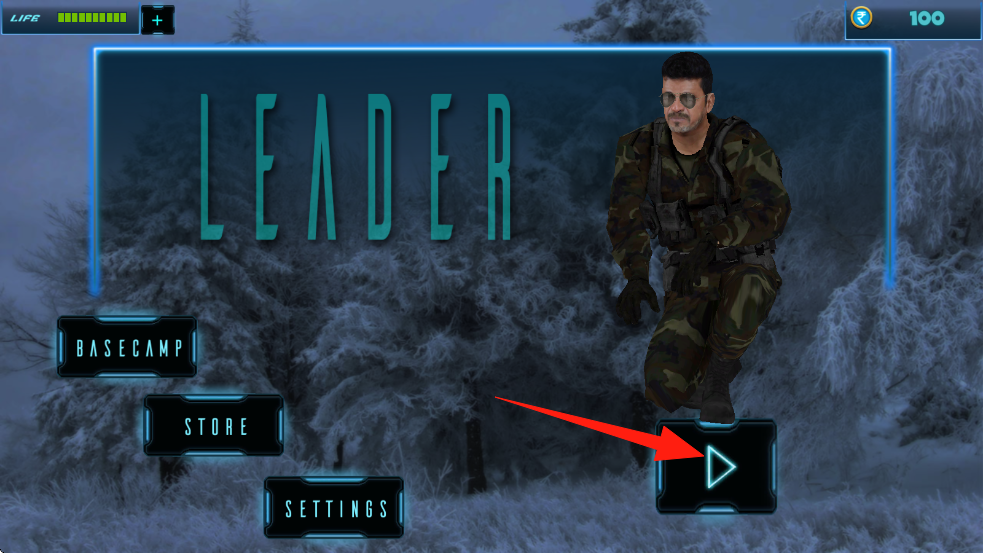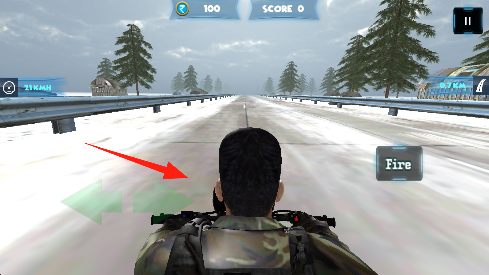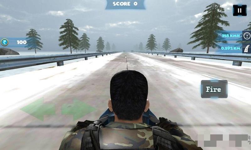 2、在主界面选播放按钮开启,于雪地公路用绿色箭头操作人物移动,遇情况点“Fire”。