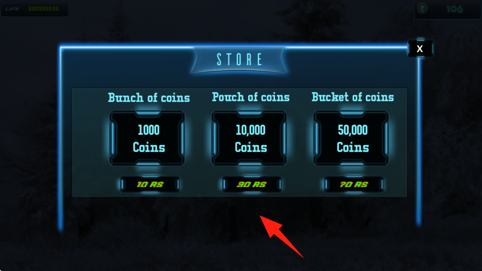 3、从主界面进入后,在雪地道路靠左右箭头调整方向前行,还可去商店购买金币。