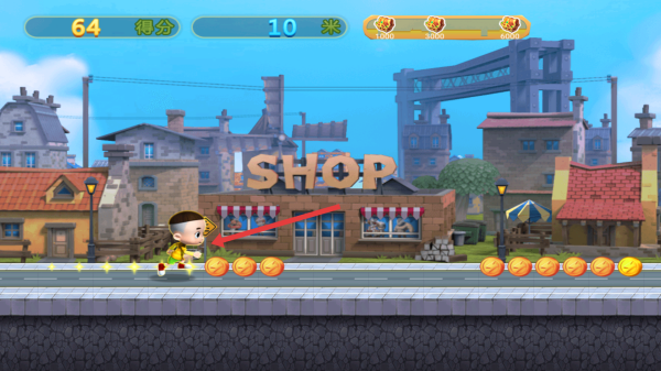3、跑酷操作:在道路上,避障碍、吃金币,用“急速冲刺”道具,冲高分、赢奖励。