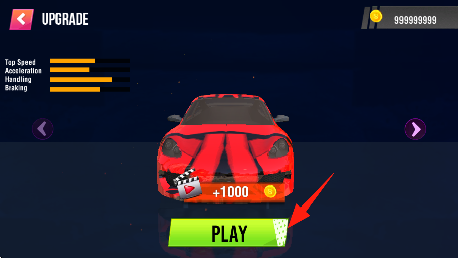 2、进入升级界面,确认车辆属性后,点【箭头】所指“PLAY”,开始游戏。