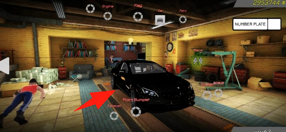 2、进入车库,对黑色汽车,按【箭头】指向部件,进行改装、维护,提升性能。