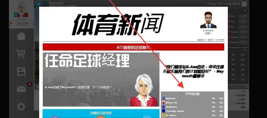 1、开局通过体育新闻,确认足球经理任命,了解俱乐部(Waymouth)基础信息,按指引熟悉管理流程。