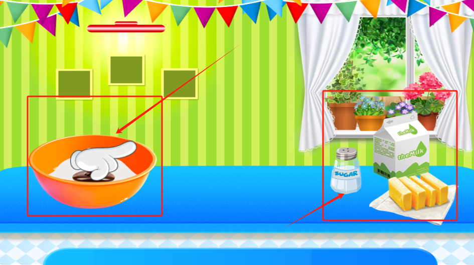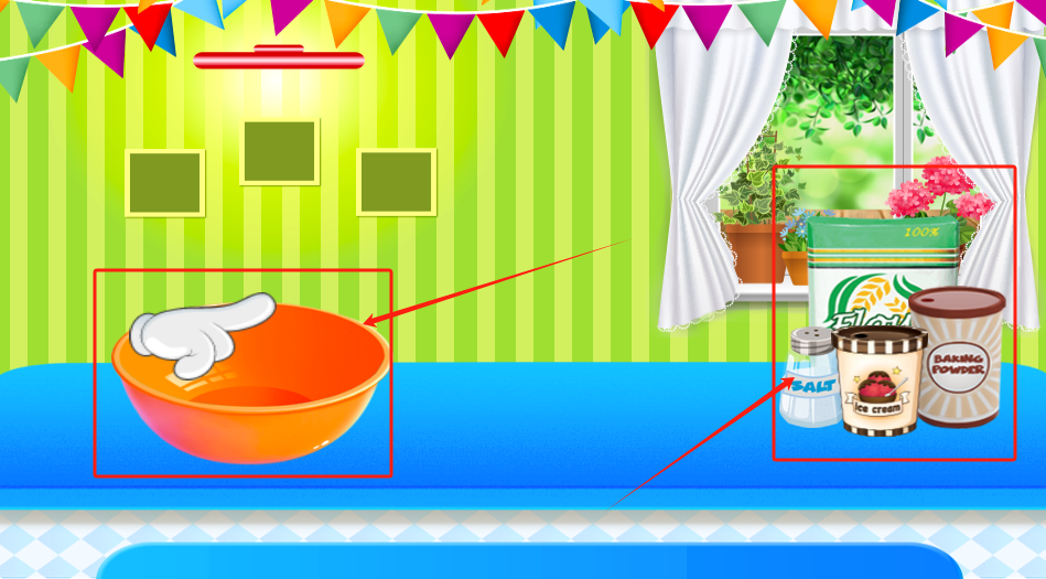 1、基础制作流程:点击右上角蓝色PLAY按钮开始游戏,按红色箭头顺序将面粉、泡打粉倒入橙色大碗,加入牛奶和糖后,用白色手套道具搅拌材料。