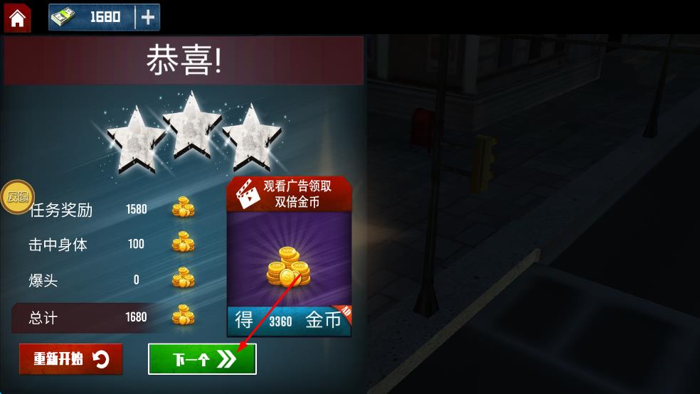3、找准时机点击射击按钮完成击杀,系统会自动触发子弹时间特效展示命中过程,根据击杀精度与任务完成度结算金币奖励,用于解锁新型狙击枪械与战术配件。