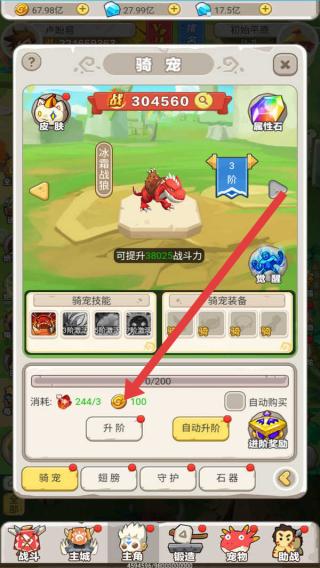 2、骑宠界面,消耗244/3金币和100道具,点击【升阶】,提升骑宠等级,增加304560战力,强化属性。