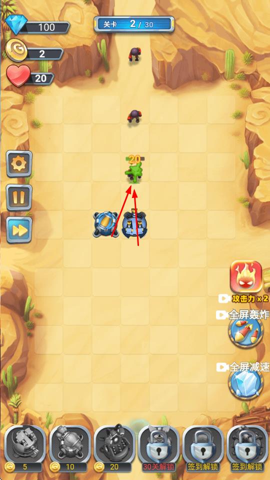 3、完成关卡获取钻石、金币,解锁新炮台(30关、签到解锁),升级强化,推进后续关卡。