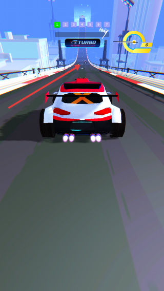 1、操控赛车沿城市道路加速,留意“TURBO”标识,触发氮气冲刺,借直道提速,应对高架桥前的短距加速段,把控方向防冲出。