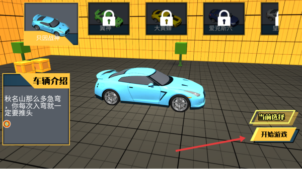 2、从首图点“开始游戏”,在车库选可用车,看介绍后点“开始游戏”进入赛道驾驶。