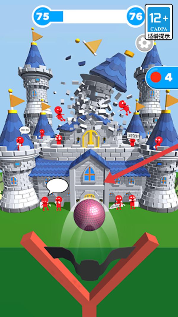 1、进入游戏后,需要调整弹弓角度,发射粉色球,瞄准城堡主体,破坏建筑结构,消灭红色小人,推进关卡。
