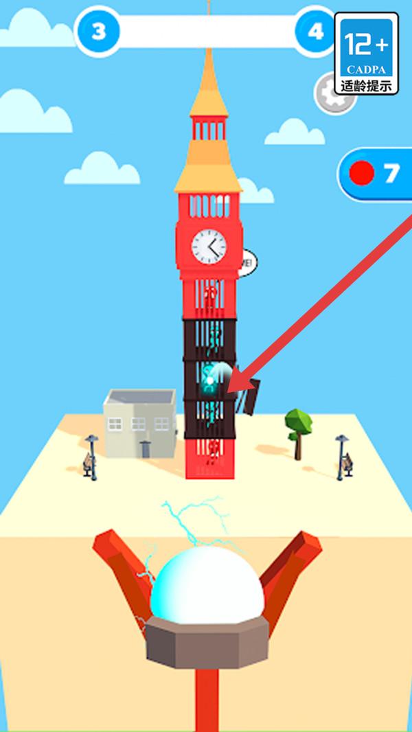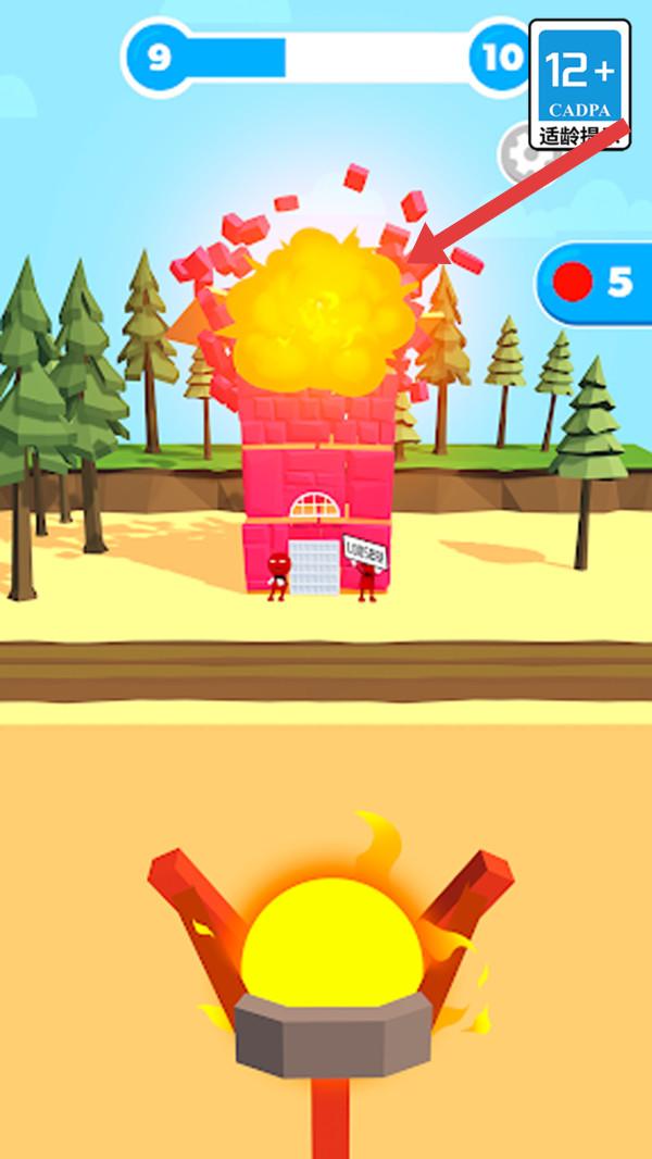2、操控者在不同场景需要切换火焰球,调整弹弓力度,发射后引爆粉色建筑,借爆炸范围扩大破坏效果。