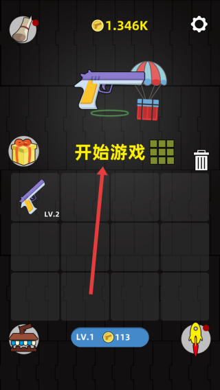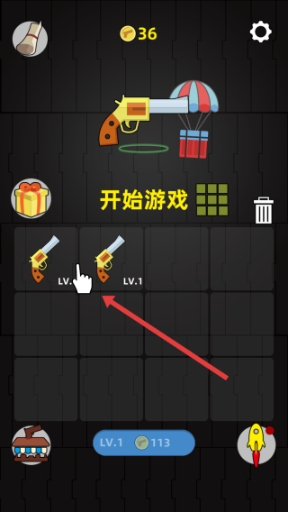 1、在武器合成页,拖动相同LV.1手枪合成,提升武器等级(如到LV.2),消耗金币,增强射击能力。