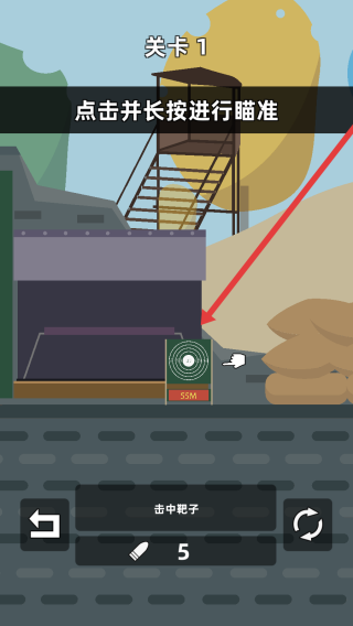 3、关卡1中,按提示“点击并长按进行瞄准”,对准靶子区域射击,消耗子弹,完成“击中靶子”任务。