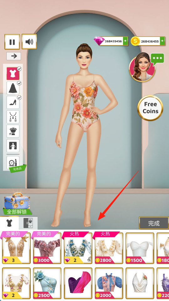 1、进入界面后点击箭头处,跟随指引了解游戏,用初始资源开启新娘造型设计之旅。