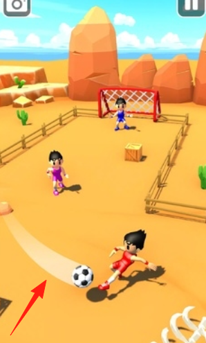 1、沙漠场景,操控红色球员,沿【箭头】方向,瞄准球门,踢射足球。