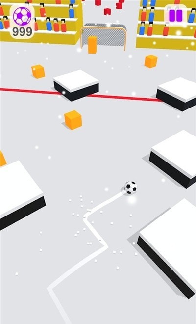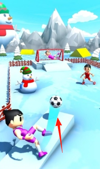 2、雪地场景,控制紫色球员,借助【箭头】所示平台,调整角度,射门得分。