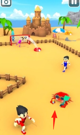 3、沙滩场景,操作角色,绕过【箭头】指向螃蟹等障碍,完成射门挑战。