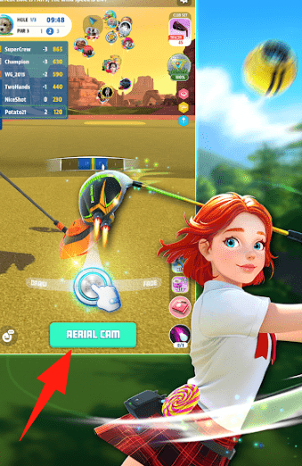2、击球操作时,点击【箭头】指向的“AERIALCAM”按钮,切换视角,更好观察球的轨迹。