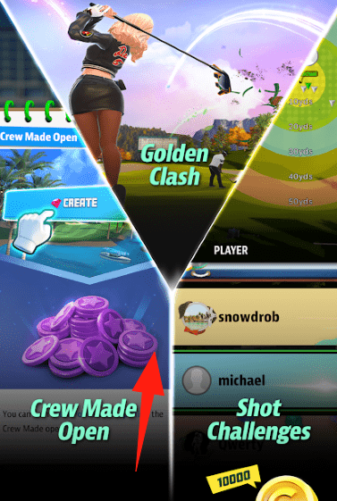 3、赛事选择界面,点击【箭头】指向的“CrewMadeOpen”赛事,参与比赛,赢取奖励。