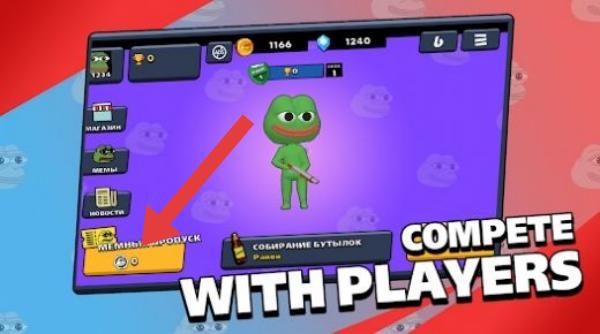 2、展示了角色(青蛙形象角色),界面左侧有一些功能选项,下方箭头所指区域是奖励或道具领取相关,底部文字“COMPETEWITHPLAYERS”意思是与玩家竞争。