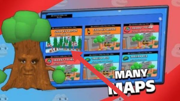 3、展示了多张地图,画面文字“MANYMAPS”意为“许多地图”,左侧有个拟人化的树角色,画面中地图有不同场景布置。