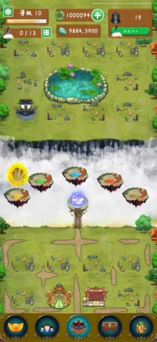1、场景地图中,点击悬浮岛屿探索,完成任务获取资源,优先升级主建筑,解锁更多功能与玩法。