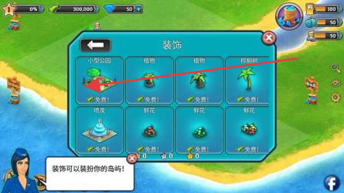 2、装饰选择界面,挑选免费的“小型公园”“植物”等装饰,美化岛屿环境,提升居民满意度和城镇吸引力。