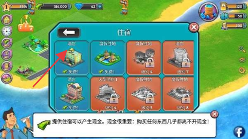 3、住宿设施建设,前期解锁免费酒店、度假胜地等,随着等级提升,逐步解锁高级住宿建筑,通过提供住宿获取现金。