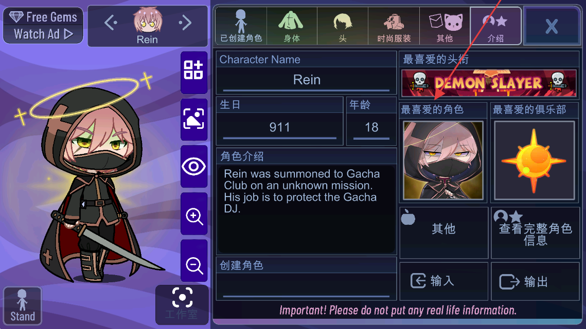 3、查看角色详情(如Rein信息页),了解背景与设定,利用“输入”“输出”分享/导入角色数据,参与“战斗”“小游戏”获取资源,升级角色。